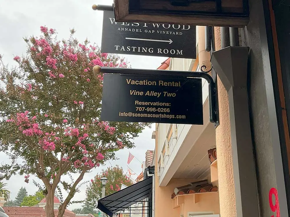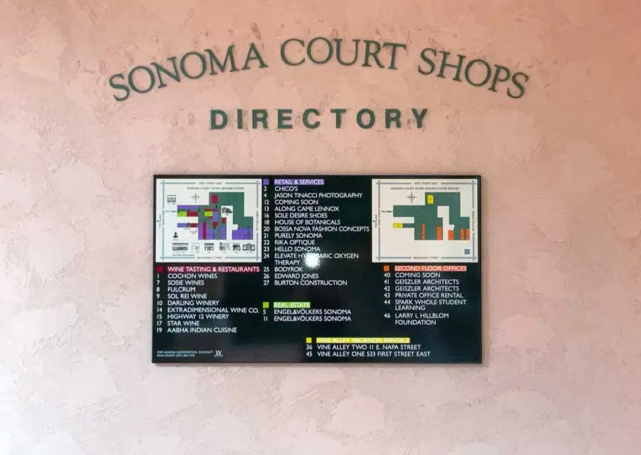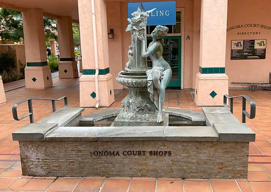 Centrally located on the south side of the Plaza, facing the historic City Hall, the Sonoma Court Shops have become a modern-day landmark and a visual anchor for this area, teeming with foot traffic. Visitors are drawn to its picturesque Mission-style architecture, sparkling fountains and tranquility often stopping to snap a picture under the flower and vine-covered arches.